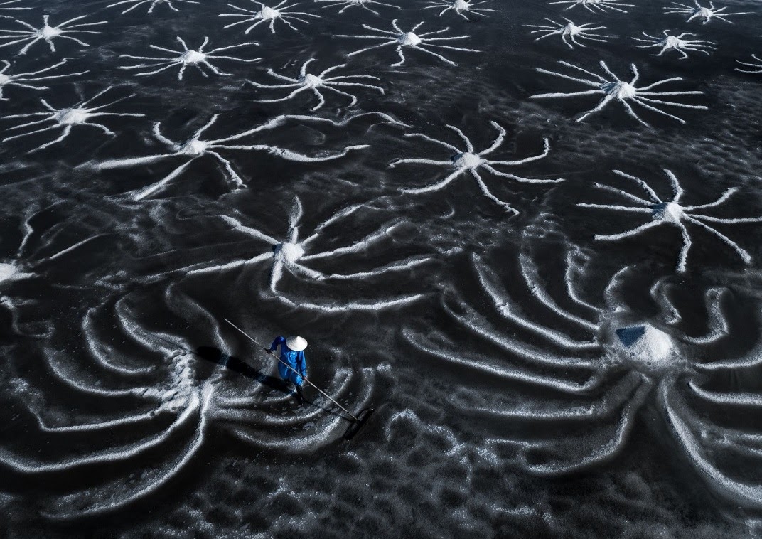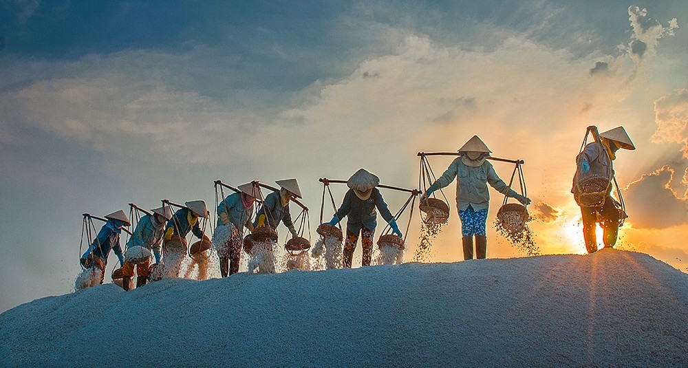 Unlike most salt fields in Vietnam, the strenuous task of tending to Hon Khoi salt fields is carried out by middle-aged women, which takes place between 04:00 and 09:00 AM. To protect themselves from the heat and salt, these salt workers wear conical hats, rubber gloves, and boots, as well as facemasks. While conditions are harsh during these months, they are very approachable and friendly. Hon Khoi salt fields are also popular spots for photography, where you can capture great views of the salt mountains and workers carrying heavy baskets across the fields well as a pagoda that sits atop a nearby hill.